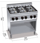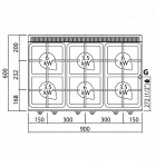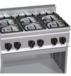 Fourneau gaz 6 feux vifs : 3 brûleurs Ø 120 mm + 3 brûleur Ø 90 mm étanches à haute puissance, entièrement construits en fonte avec finition externe nickelée, garantis à vie, actionnés par un robinet à vanne et fixés hermétiquement au plan en acier AISI 304 à moulage profond.