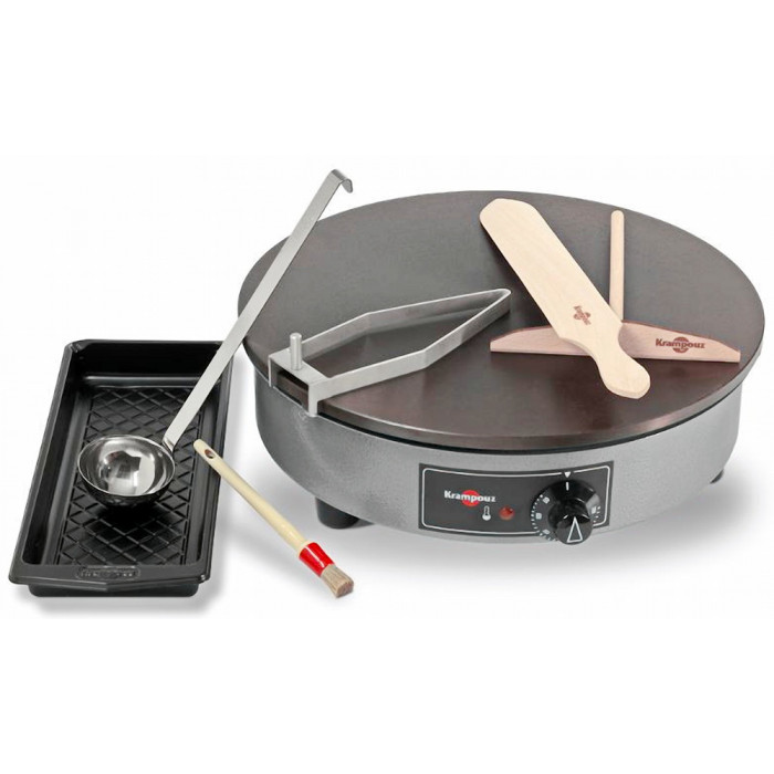 - 1 étaleur Easy Crep' en inox triangle breveté par Krampouz - 1 louche doseuse en inox d'une contenance 90 ml, type ménagère soudée (réf ALIM70 = AD0727) - 1 râteau ou "rozell" à crêpe plat en bois de hêtre d'une largeur de 180 mm, pour étaler la pâte à crêpe finement (réf ARH18) - 1 spatule plate ou "spanell' en bois de hêtre de longueur totale 400 mm (dont 100 mm partie manche), largeur de la raclette 45 mm, pour détacher et retourner vos crêpes et galettes (réf ASH40) - 1 bac à eau en plastique noir et un pinceau pour nettoyer l'étaleur - 1 livret notice d'utilisation