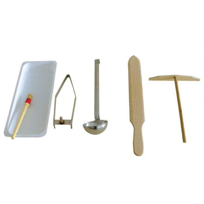 Easy Crep kit d'étalement de pâte à crêpe ou galette pour crêpière plaque fonte de diamètre Ø 40 cm, pour réaliser des crêpes et des galettes rondes et régulières. Étalement facile en un tour de main. Kit comprenant : 1 étaleur Easy Crep' breveté en inox, 1 louche doseuse en inox, 1 râteau rozell en bois de hêtre, 1 spatule spanell en bois de hêtre, 1 bac à eau plastique et un pinceau pour nettoyer l'étaleur.