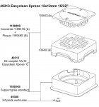 Le Kit complet EasyClean Xpress 12x12 Robot Coupe 49313 en plastique noir, comprend : - 118934S le support grille socle standard, avec ses 4 pieds ventouses (49300) inclus - 118949S l'ensemble bloc poinçons 12x12 : ‣ Couvercle poussoir supérieure 12x12mm (15/32" x 15/32") munie des poinçons [118947S (A)] ‣ Plaque de sécurité inférieure 12x12mm (15/32" x 15/32") servant de guide d'alignement des poinçons [118948S (B)]