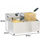 Friteuse électrique double professionnelle top de table à poser, 2 cuves, d’une capacité de 8 litres chacune. Boitier, couvercle, tableau de commande en acier inoxydable. Résistances 2 x 3,25 kW. Alimentation 230V monophasé, avec 2 prises de courant indépendantes. Zone froide. Dimensions : L 550 x P 430 x H 340 mm. Thermostat de sécurité. Réglage de la température de 60°C à 190°C. 2 paniers : 2 x L 190 x P 240 x H 140 mm. Résistances et cuves amovibles pour le nettoyage.