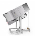• Dimensions extérieures du GT110/1TS en cours de mise en place et d’installation : possibilité de basculer le four sur son support muni de roues en portant l’encombrement à 800 mm de largeur et 1960 mm de hauteur et permettre le passage à travers une porte de dimensions courantes. Procédé : le four se bascule manuellement en actionnant un treuil à manivelle avec système à cliquet et enroulement de câble acier.