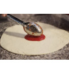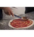 Dose idéale pour préparation de la pizza typique "vera pizza napoletana", selon la recette napolitaine traditionnelle. Le dessous de la cuillère doseuse à pizza est écrasé pour former un fond plat, étudié pour faciliter le mouvement typique circulaire du pizzaïolo lorsqu'il étale la sauce tomate pour garnir la pizza. Son long manche inox et sa longueur hors-tout de 335 mm empêche la cuillère de glisser dans le récipient à sauce tomate à pizza.