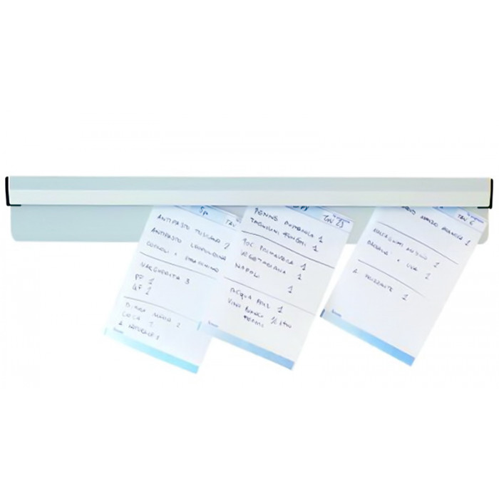 Porte bon de commande à sphère, réglette en aluminium anodisé, très pratique, les tickets de commandes s'insèrent immédiatement et sont maintenus par un système de pincement à billes. Les billes utilisées étant particulièrement bien proportionnées de grandes tailles et légères en poids l'utilisation en est grandement facilité. De qualité GI-METAL, ce porte bons de commandes est adapté au fin papier thermique, ou aux feuillets plus épais. Longueur totale : 60 cm. PCM60 GI-METAL Italie.