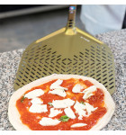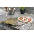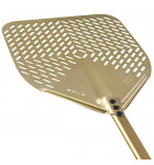 Pizza Peel square head 33 cm 13" perforated anodized aluminum Surface de la pelle anodisée G.H.A. (Golden Hard Anodising) Pelle à pizza haute performance de la Ligne GOLD GI-METAL Italie Robuste et en même temps extrêmement légère : 0,63 kg Manche en aluminium anodisé Gold Longueur du manche seul : 1,20 m Longueur totale manche + pelle : 1,56 m
