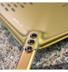 Pelle à pizza rectangulaire 33 cm GOLD GI METAL avec tête perforée en aluminium anodisé G.H.A. (Golden Hard Anodising), une exclusivité Gi.Metal dans l'univers des pelles à pizza. Manche en aluminium anodisé Gold. - Pour les pelles expédiées réf G-32RFX/120 : manche 2SMART à monter en 2 parties (détail voir dernière image) - Pour les pelles retirées à StockResto ZI Hoerdt Strasbourg réf G-32RF/120 : manche d'un seul tenant (ou au choix à monter)