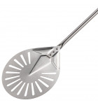 Take-out Pizza Peel round head 20 cm 8" perforated in stainless steelPelle avec poignée coulissante sur le manche permettant de tourner les pizzas durant la cuisson Pelle à pizza tournante haute performance de la Ligne Azzurra GI-METAL Italie Robuste et extrêmement légère : 0,55 kg Manche en acier inox Longueur du manche seul : 0,75 m Longueur totale manche + tête/pelle : 0,96 m