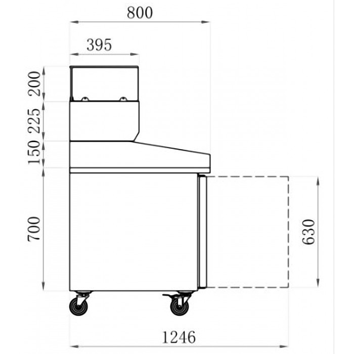 Livré avec une vitrine à ingrédients (froid statique) capacité prévue pour 9 bacs GN1/3-150mm, ou 18 bacs GN1/6 (bacs GN non inclus)