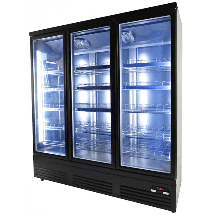 Vitrine réfrigérateur noir 1880 mm avec 3 portes vitrées, spéciale supermarchés. Température de : 0ºC/+10ºC. Portes à fermeture automatique. Étagères réglables. Affichage numérique de la température. Système de refroidissement ventilé garantissant une température uniforme et une réfrigération efficace. L'éclairage LED intérieur met vos produits en valeur. Portes chauffées empêchant la condensation (peut être facilement activé ou désactivé). Dimensions extérieures : L 1880 x P 705 x H 2050 mm. Puissance 1080 W. Capacité 1600 litres. Poids net 214 kg.