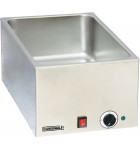 Bain-marie en acier inoxydable. Cuve capacité GN 1/1 de profondeur 150 mm. Thermostat avec 5 niveaux de température de 0° à 90°C. Thermostat de sécurité en cas de surchauffe. Dimensions : L 338 x P 540 x H 248 mm. Poids : 8 Kg