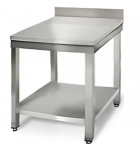 Table de travail inox adossée (dosseret H100 mm) avec une étagère intermédiaire.