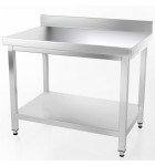 Table de travail inox adossée (dosseret H100 mm) avec une étagère intermédiaire.
