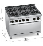 Fourneau à gaz 6 feux vifs sur four gaz BERTOS G9F6+T, dimensions : L 1200 x P 900 x H 900 mm