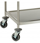 Chariot de cuisine en acier Inoxydable. 4 roues directionnelles dont 2 avec frein. Charge utile : 120 kg répartie. Dimensions des plateaux : L 830 x P 510 mm. Distance entre les plateaux : 275 mm. Dimensions extérieures du chariot de cuisine : L 920 x P 600 x H 945 mm. 4 tampons de butés circulaires en plastiques. Poids : 13 Kg.