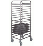 Réalisation en acier inox AISI 441, finition brossée et polie. Glissières inox 15/10 soudées avec butoir. Espace utile entre glissières 75 mm. 4 roues pivotantes dont 2 avec freins, toutes munies de pare-chocs. Modèle à monter.