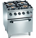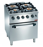 Fourneau 70x70xH85cm. 4 brûleurs 2 x 3,5 kW et 2 x 6 kW. Four gaz GN 2/1 puissance 5,2 kW. Régulation four de 160°C à 310°C. 20800 Kcal-h. Top embouti, brûleurs en fonte traitée, couronne en laiton (haut rendement). Dimensions extérieures : 700 x 700 x H850 mm.