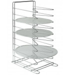 Support râtelier en acier chromé range grilles à pizza : 10 niveaux pour 10 grilles de Ø 38 à Ø 50 cm maximum. Dimensions : 40 x 34 x H65 cm. Intervalles entre les niveaux : 58 mm. La courbure à l'avant de chaque niveau du support, permet de saisir chaque grille d'une seule main depuis l'avant.