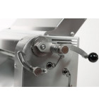 Système exclusif et breveté de réglage micrométrique de l'épaisseur de la pâte : La manette-levier à la fois pratique et robuste agit sur un système à engrenages. Elle permet sans effort de régler avec précision et en douceur, sans palier fixe préétablie, l'écartement des rouleaux de façon progressive de 0 à 15 mm d'ouverture maximum. Cette ouverture maximale aussi grande permet la prise d'une pâte initiale d'une épaisseur de 40 mm. Grande facilité de manipulation de l'abaisse grâce aux deux rouleaux libres d'entraînement associés à la glissière d'introduction de la pâte. Réglage de l'épaisseur finale de l'abaisse grâce à une lunette de butée pratique et robuste. Simplicité de réglage du parallélisme des rouleaux sans devoir démonter aucune protection.