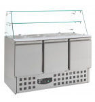 Saladette vitrine réfrigérée inox 3 portes avec pare-haleine en verre et étagère verre intermédiaire et support plan de découpe en polyéthylène de 135 mm - Dim 1365x700xH850/1310 mm - 7950.0405