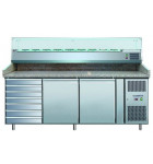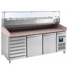 Table pizza dessus comptoir granit avec 2 portes et 7 tiroirs neutres. Livré avec vitrine à ingrédients emplacement pour 9 bacs GN1/3. Refroidissement intérieur adapté pour grille ou bacs euronormes pâtissiers de 600x400 mm. Dimensions extérieures L2025 x P800 x H1435mm