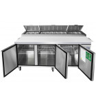 Meuble préparation pizzas, construction intérieure et extérieure en acier inoxydable (arrière et dessous en galva). Dessus plaque en polypropylène blanc démontable, d'une profondeur de : 490 mm. Dimensions extérieures : L 2362 x P 840 x H 1102 mm (H plan 950 mm). Thermostat numérique Dixell / Carel. Froid ventilé. Évaporateur traité cataphorèse. Grilles sur taquets (4 taquets par grille). Livré avec roues de série avec freins en façade. Dessus compartiments pour bacs GN. Couvercles démontables. Poignées encastrées. Dégivrage automatique. Angles intérieurs arrondis. Fermeture de porte par rappel automatique. Maintient de porte en position ouverte à 90°