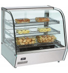 Vitrine chaude à poser, 120 Litres, 3 grilles chromées réglables. Thermostat réglable de +30°C à +90°C. Puissance 1,1 kW. Avec un bac à eau pour l'humidification. Vitre bombée. Intérieur chromé, extérieur en inox. Service arrière avec 2 portes coulissantes. Éclairage LED. Poids net 48 kg