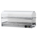 Couvercle en plastique transparent et base inox. Ouvertures basculantes vers le haut des 2 cotés de la vitrine. Thermorégulation interne réglable de +30°C à +60°C. Les produits sont maintenus au chaud à une température constante sans dessèchement grâce à un système d’humidification intégré à tiroirs avec éponge humide.