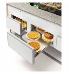 Châssis vitrine sur 4 roues dont 2 avec freins, cette option doit être commandée avec le comptoir à l'usine impossible de l'adapter par la suite. Le délai de préparation usine de la vitrine sur roulettes est de 5 semaines.