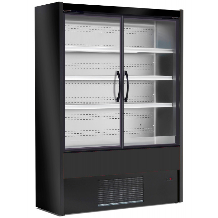 Vitrine réfrigérateur noir 1500 mm avec 2 portes vitrées battantes, spéciale libre service. Small faible profondeur : 57 cm. Plage de température : +2ºC/+6ºC. Portes à fermeture automatique. 3 étagères inox profondeur 280 mm, réglables en hauteur, avec supports fixés sur les joues. Plateau d'exposition inox bas profondeur 380 mm. Affichage numérique de la température. Système de refroidissement ventilé garantissant une température uniforme et une réfrigération efficace. Éclairage LED sous fronton supérieur. Dimensions extérieures : L 1500 x P 570 x H 1985 mm